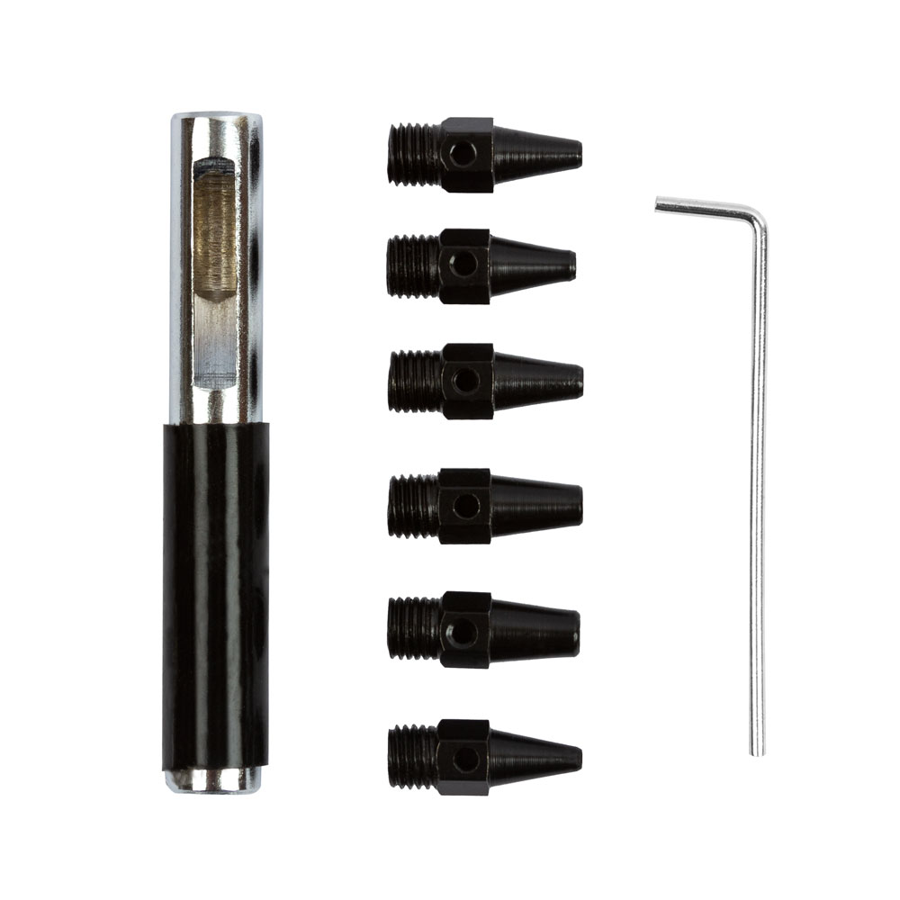 Подходит для использования в быту. Насадки сделаны из прочного металла. Имеет ручку с нескользящим покрытием. Диаметр насадок 2; 2.5; 2.8; 3.2; 4; 4.8 мм.